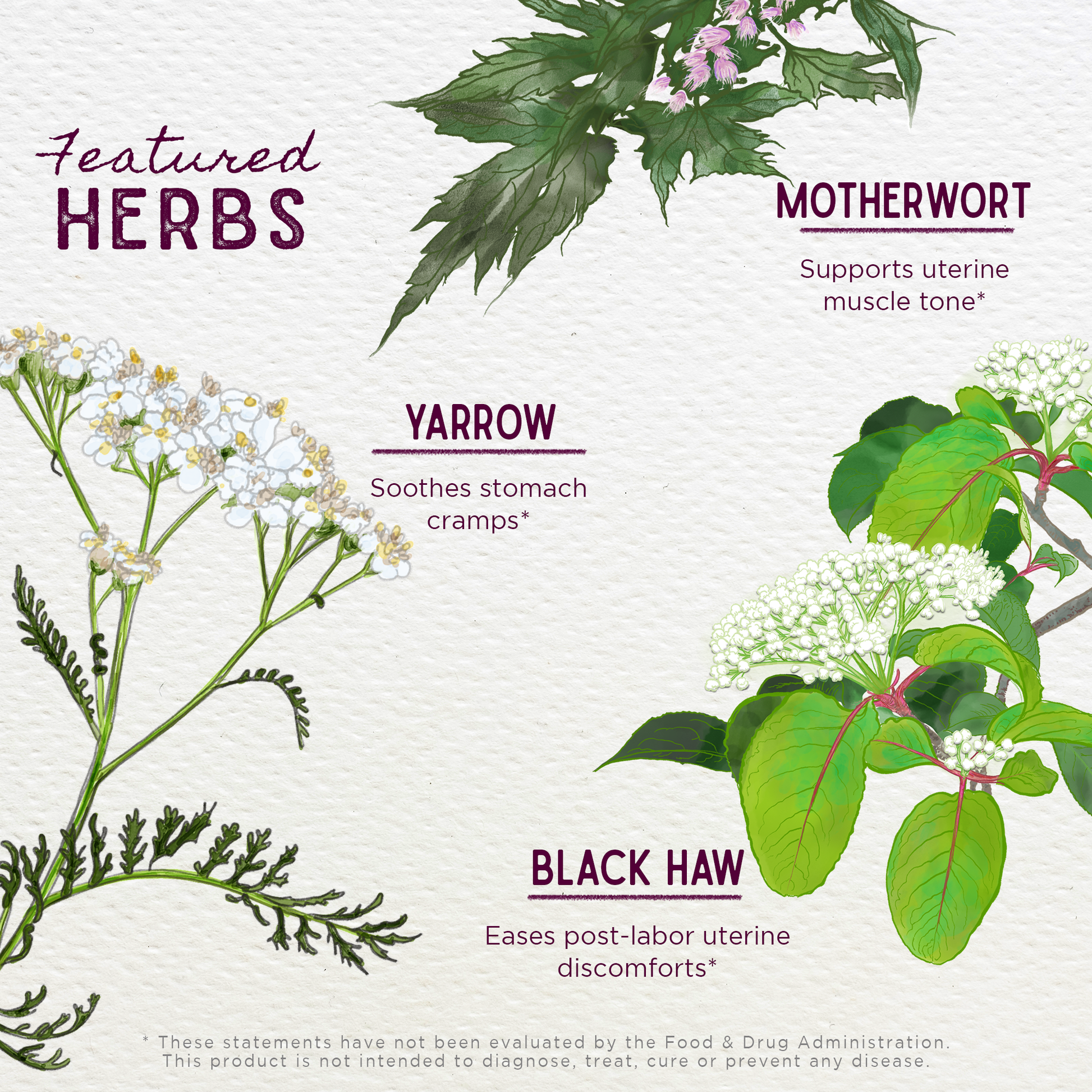 Black Haw bark: Viburnum prunifolium is well-known for its affinity to ease spasms and its traditional use in calming uterine discomfort.