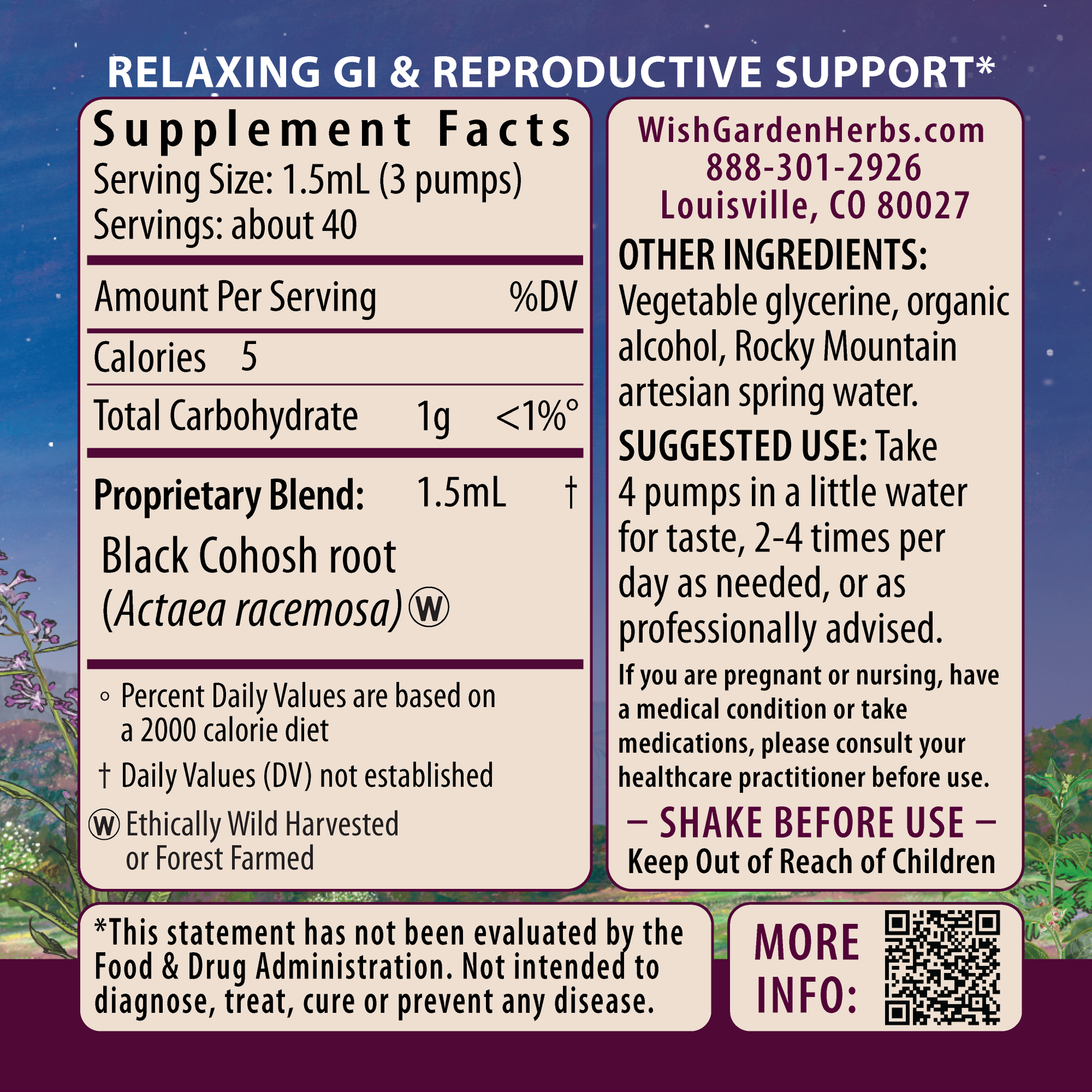 Black Cohosh root (Actaea racemosa), vegetable glycerine, Rocky Mountain artesian spring water & organic gluten-free alcohol.