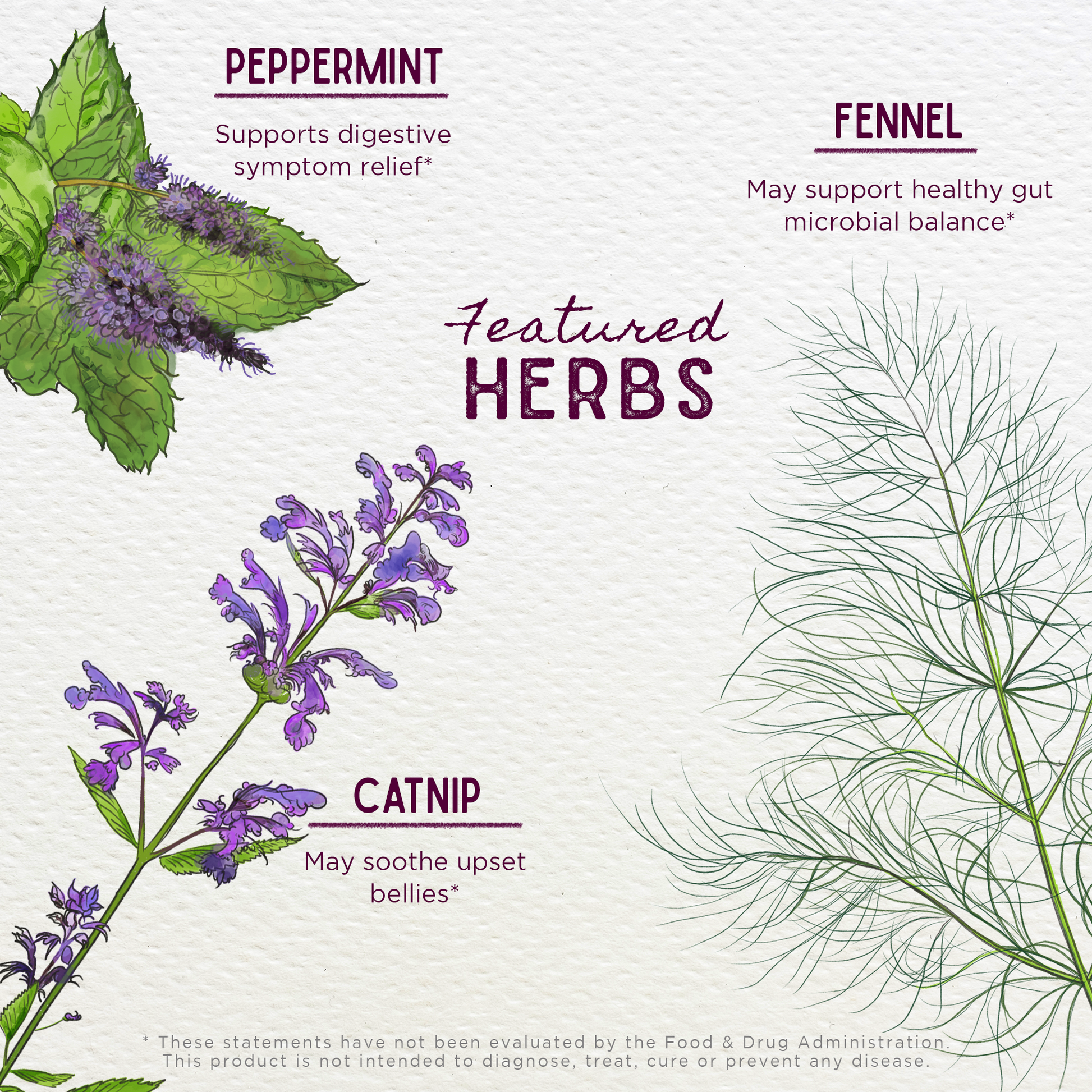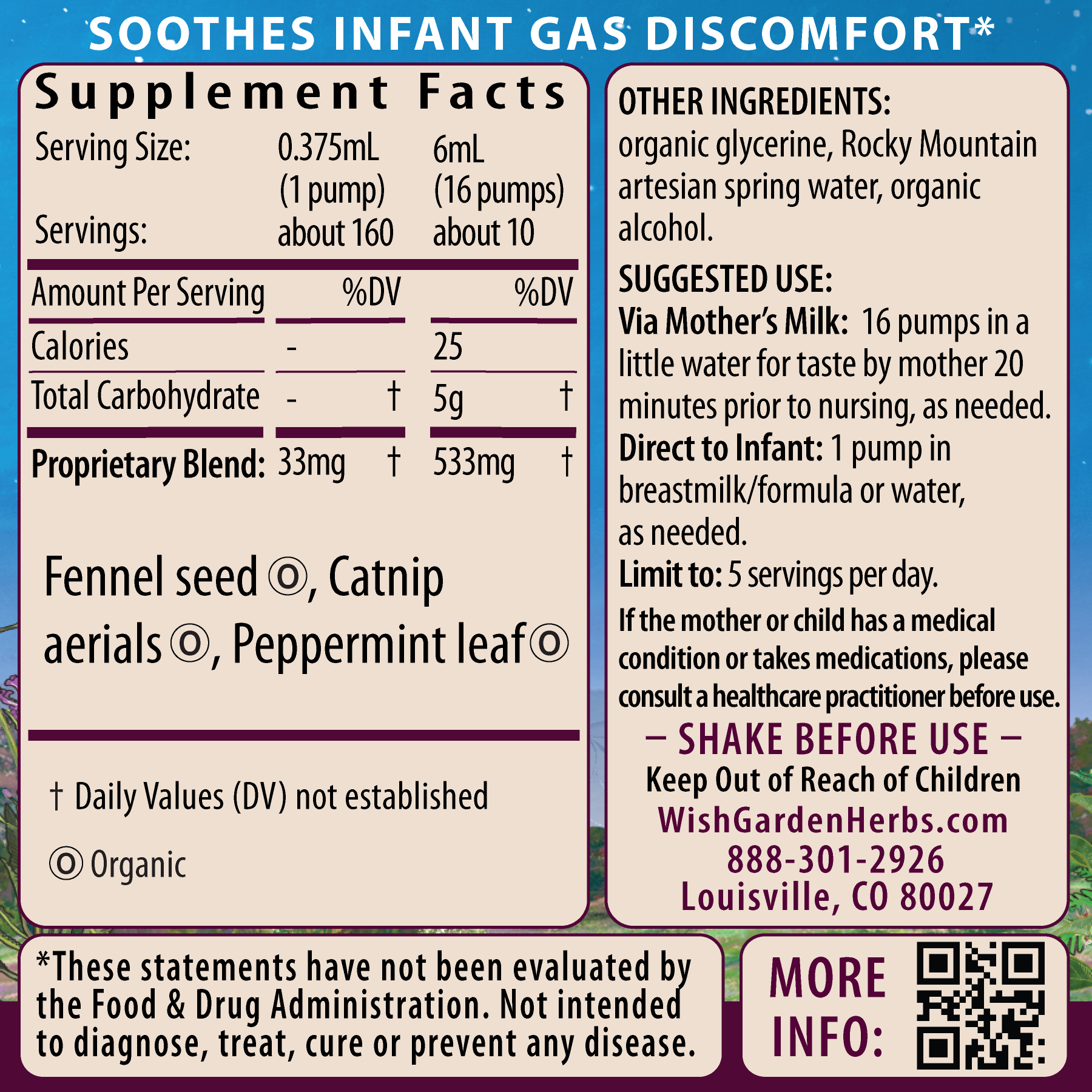 Organic Fennel seed (Foeniculum vulgare), organic Catnip aerials (Nepeta cataria), organic Peppermint leaf (Mentha piperita), vegetable glycerine, Rocky Mountain artesian spring water & organic gluten-free alcohol.
