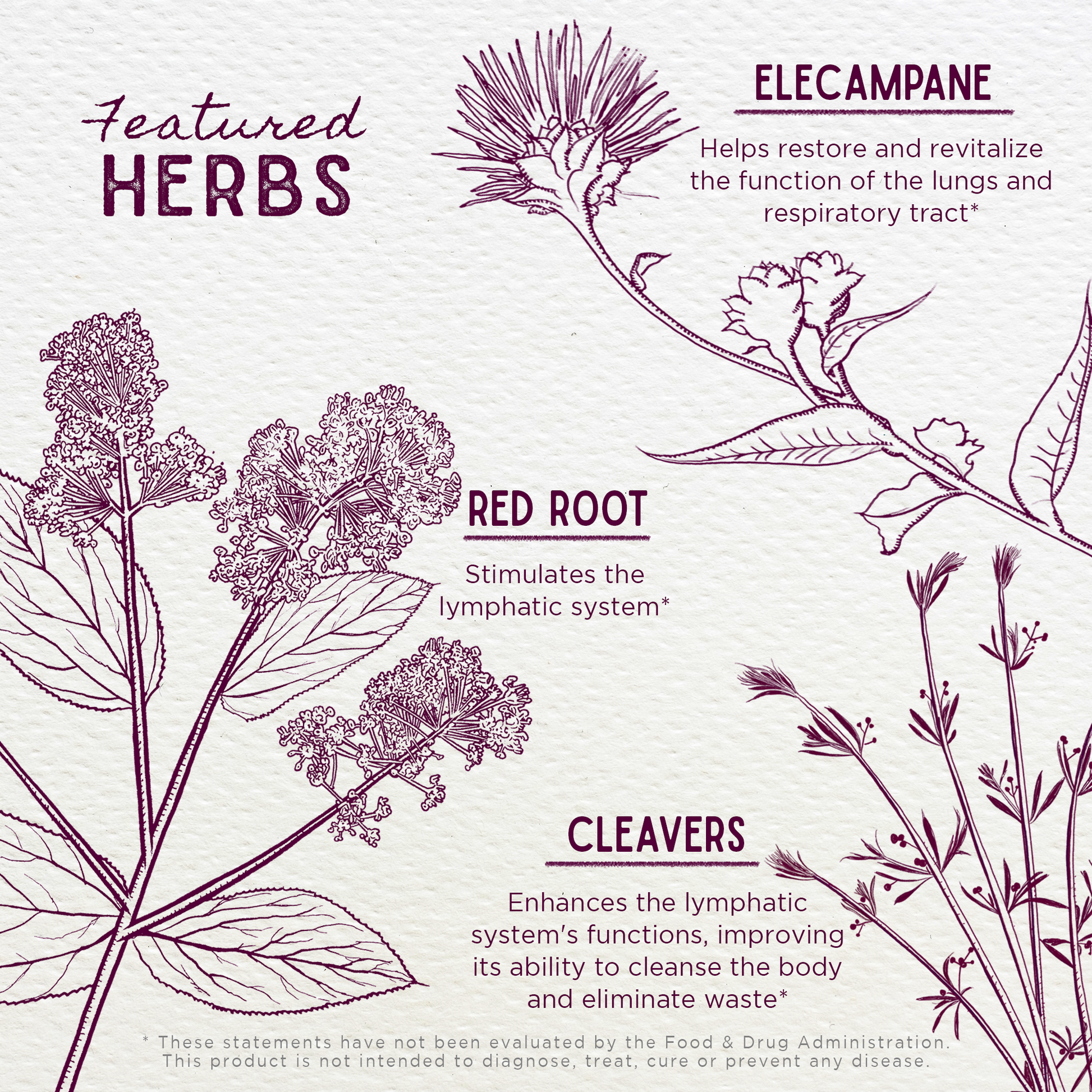 Red Root: Traditionally used to stimulate the lymphatic system, Red Root supports vital respiratory system function and the body's natural detoxification process.