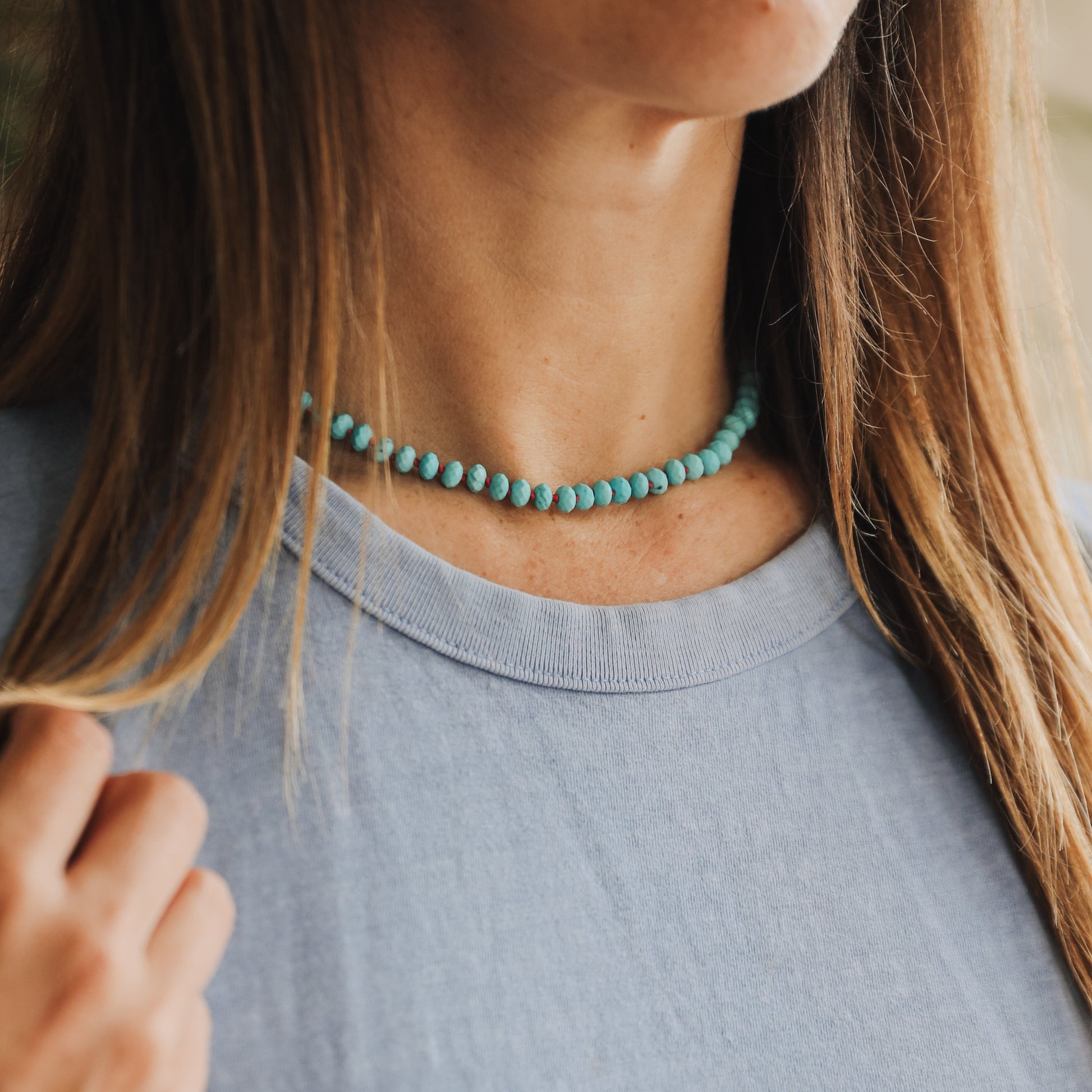 Our beaded Turquoise necklace is a favorite for many, often worn as a minimalist statement piece that carries a profound presence. Once you hold one of these beauties in your hand, you will feel the unique energy that makes it so special.