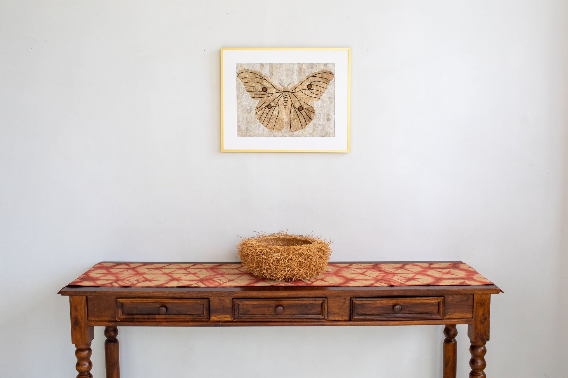 Celebrate Madagascar’s biodiversity with this bold textile art piece. Featuring the Ceranchia apollina wild silk moth—the species at the heart of our mission—this colorful wall hanging is both a stunning visual statement and a symbol of environmental stewardship.